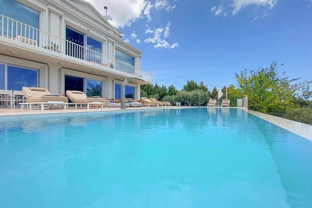 In a quiet and green environment surrounded by olive and fruit-bearing trees, lies this luxurious villa with 470m² of internal space and 2000m² of external space and gardens, with a 15m long outdoor pool (not heated) and a 18m² indoor heated pool (upon request and with an extra charge). It is an impressive building with a unique design, with elements from neoclassical architecture combined with modern lines. Greek marble, natural oak wook and glass are the dominating materials.